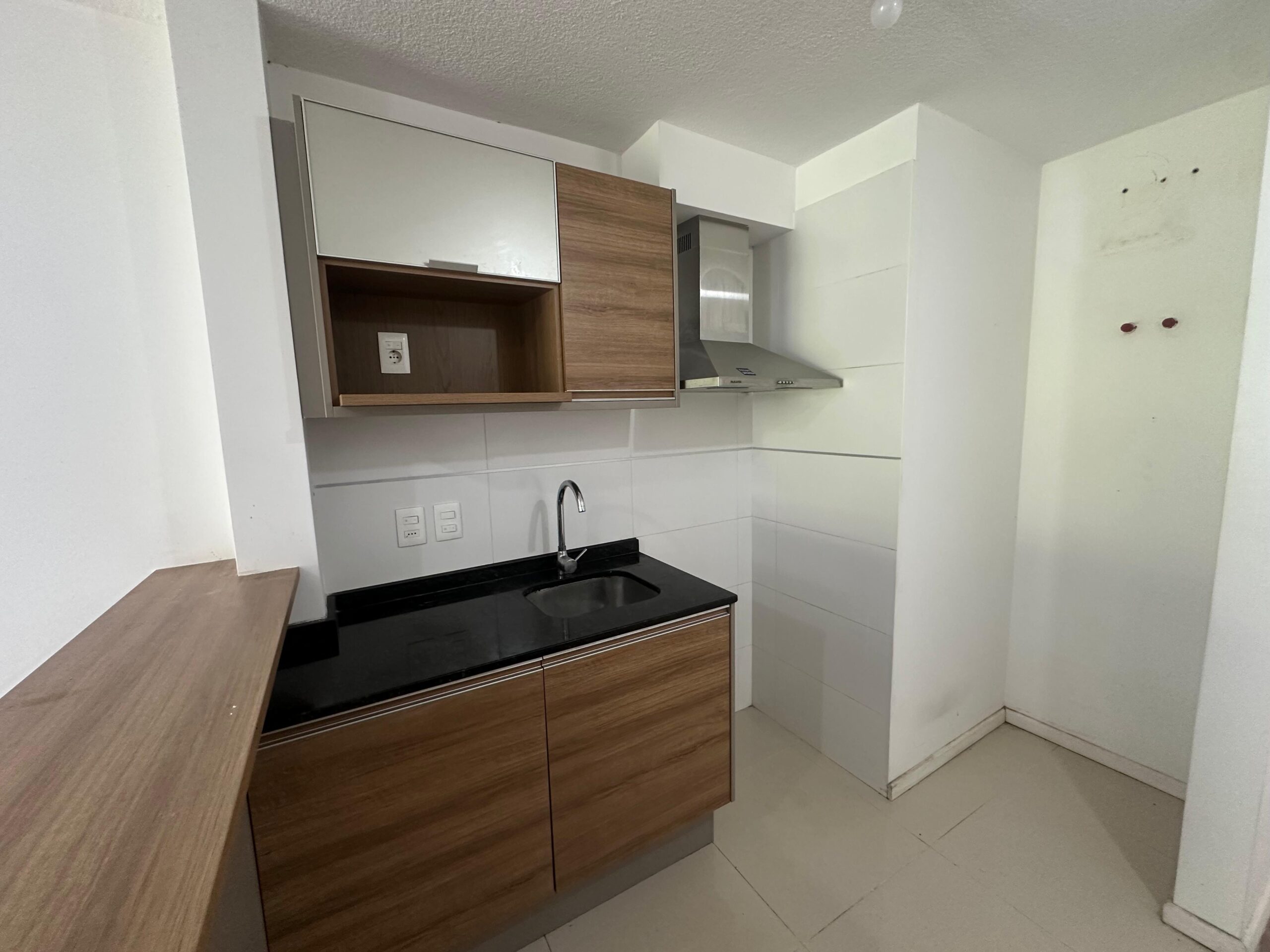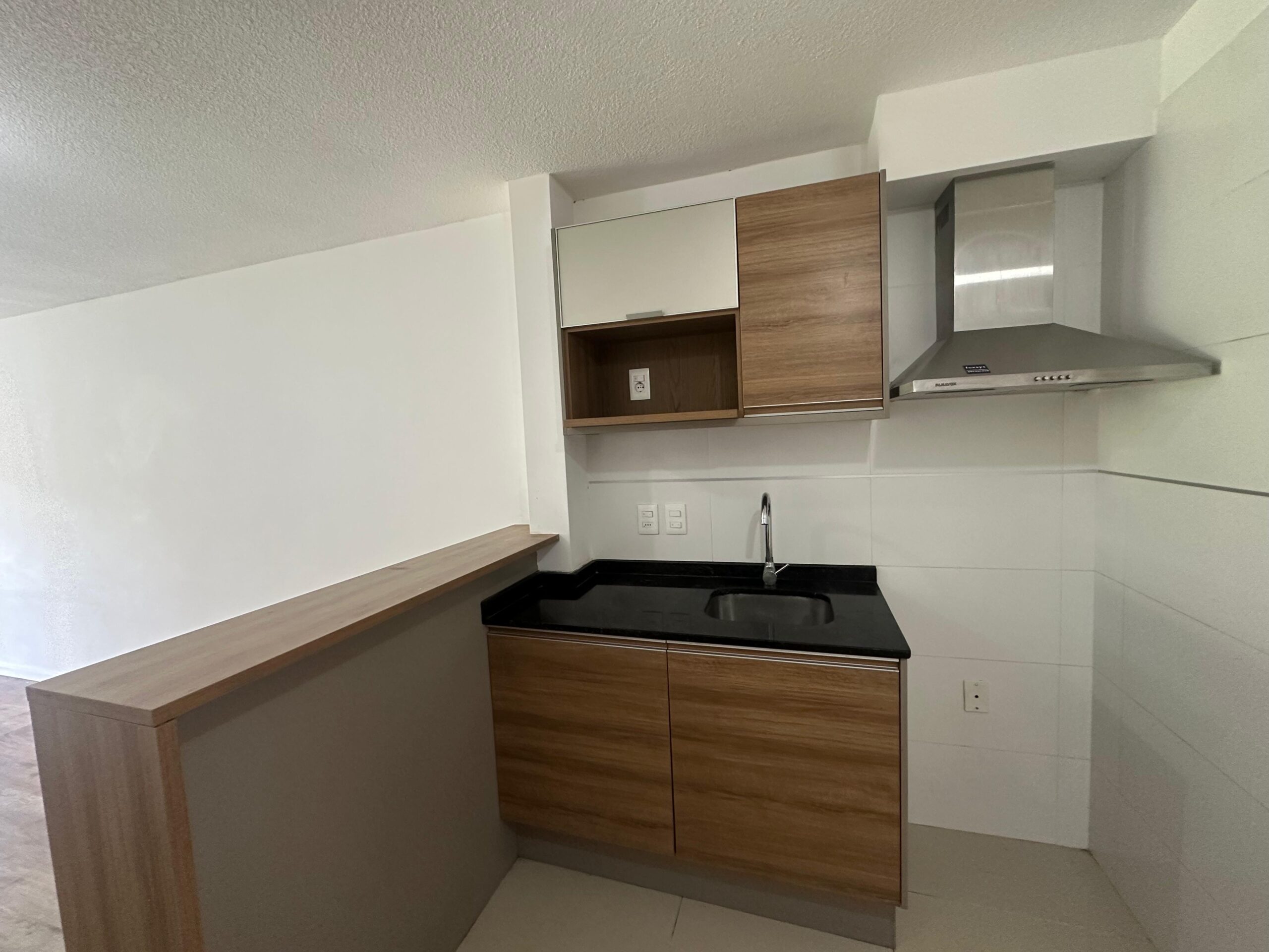 Cocina integrada con desayunador, campana y placares.