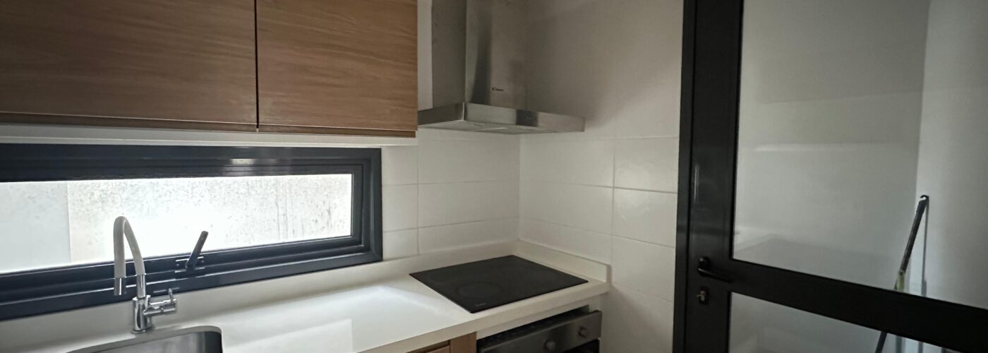 Cocina definida con placares aéreos y bajo mesada, horno, anafe y campana.