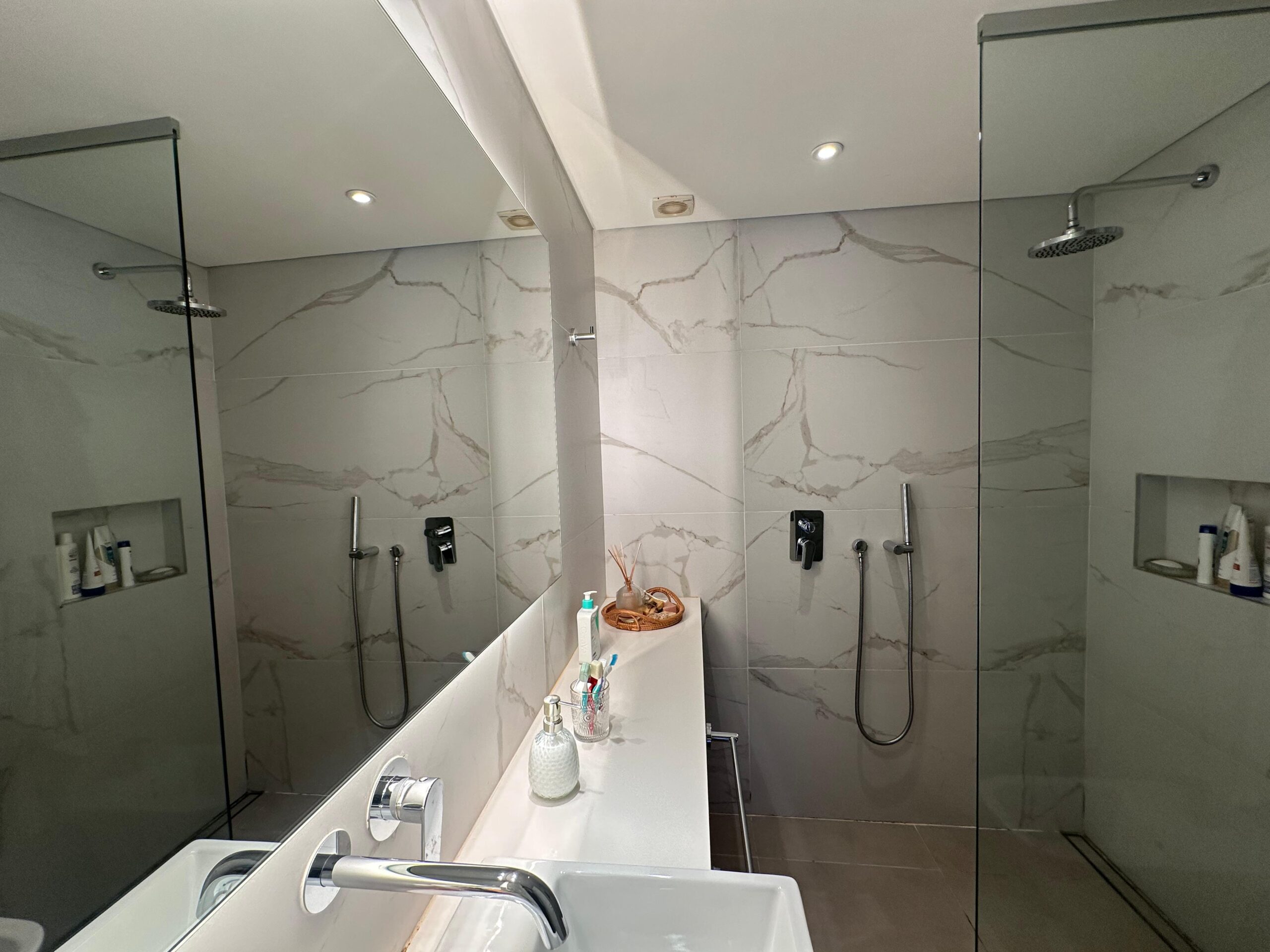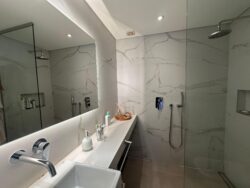 Baño completo con mampara de vidrio y extractor.