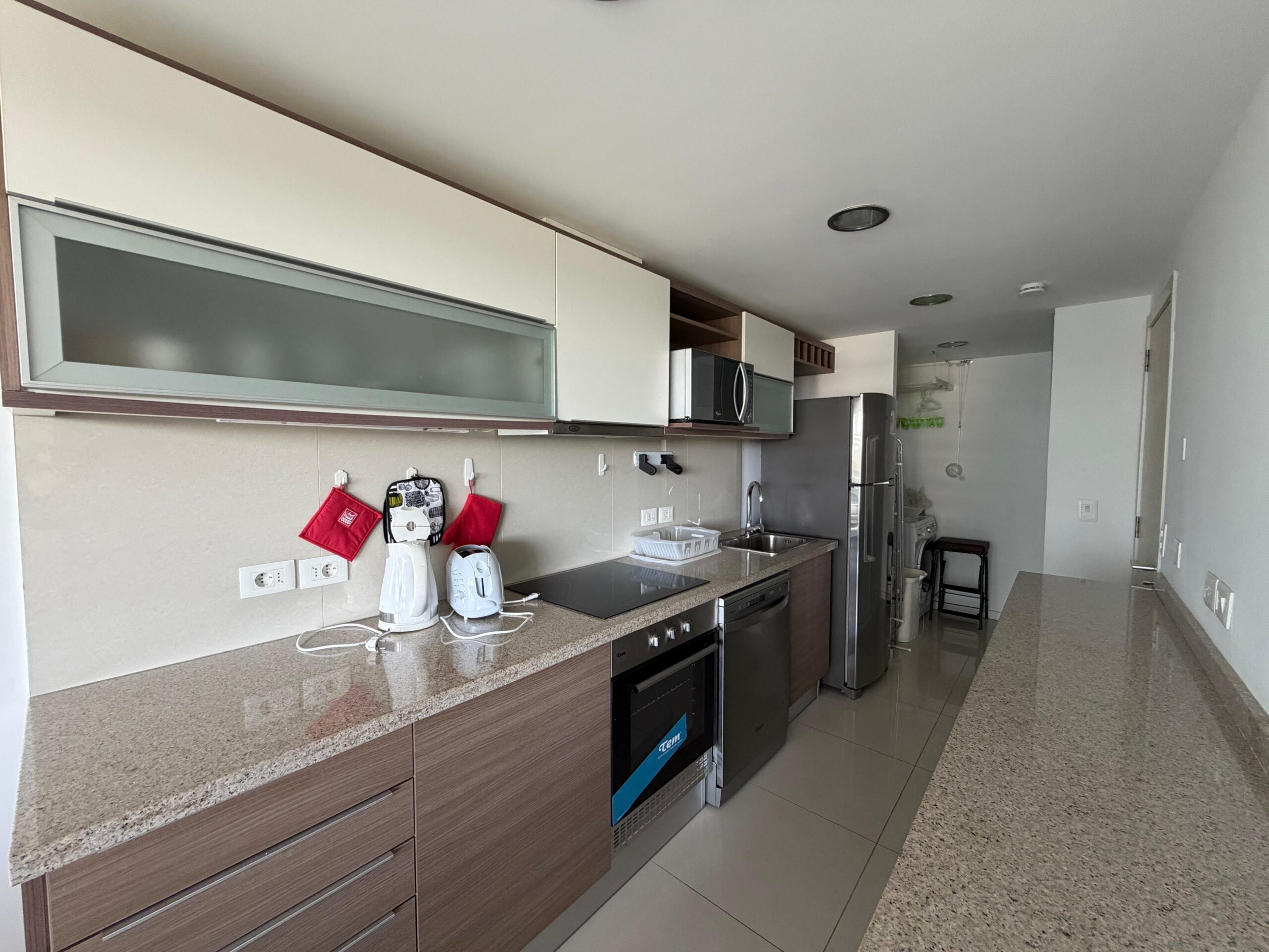 Cocina semi definida con placares aéreos y bajo mesada; Horno, Anafe y Campana.