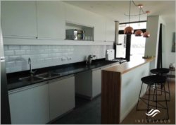 Cocina integrada con mesada de granito y placares aéreos y bajo mesada