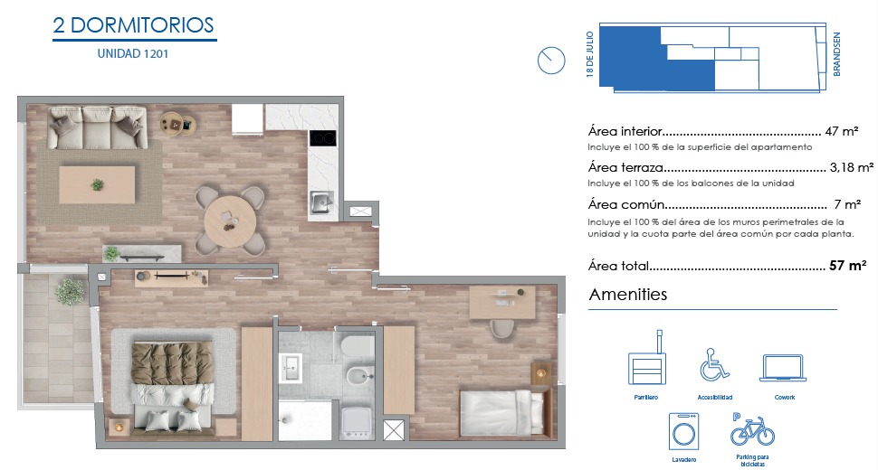 El edificio contará con Parrillero de uso común, Cowork, Lavadero y Parkimg para Bicicletas.