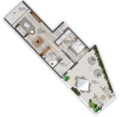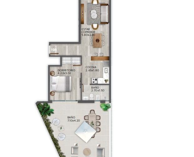 43 m2 Construidos + 37 m2 de Patio + 3 m2 de Terraza.